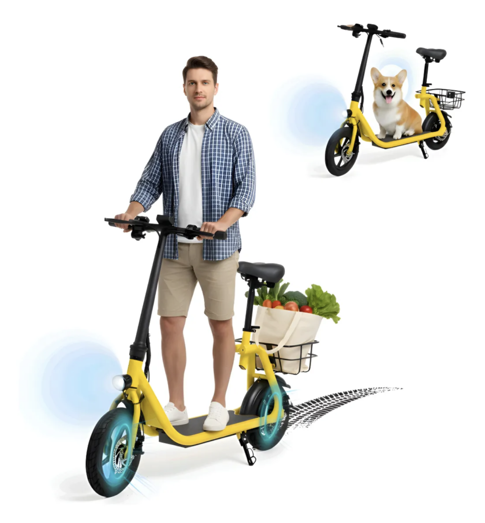 YIMA Scooter Eléctrico Plegable 450W 30km/h. – Con asiento, motor de 450 W y velocidad de hasta ~30 km/h, cómodo y práctico para desplazamientos diarios.
